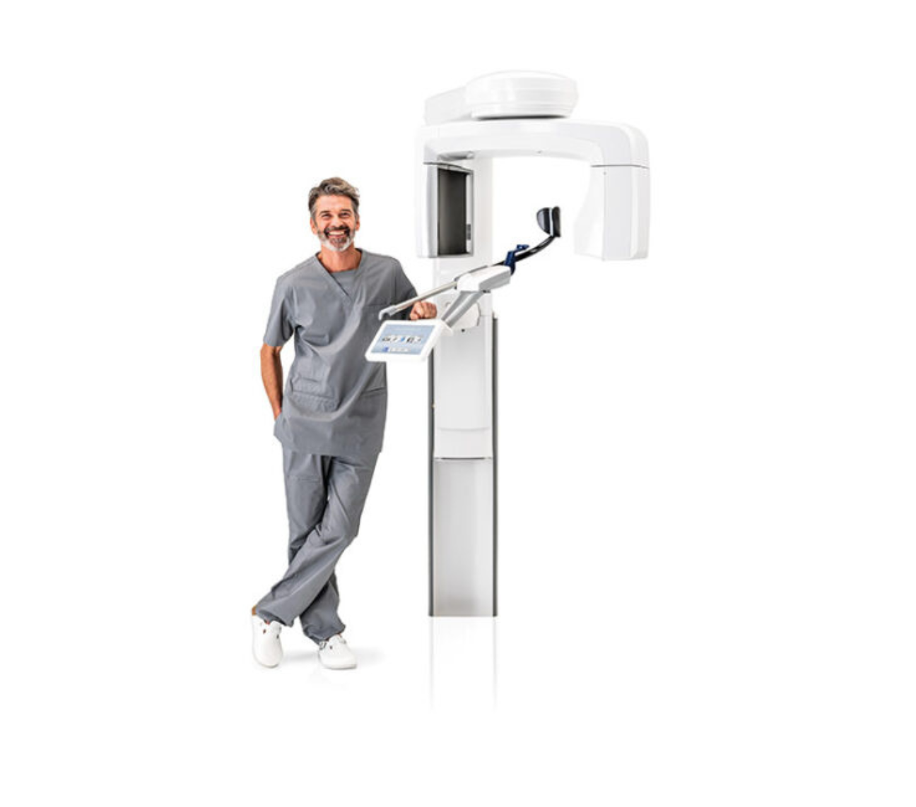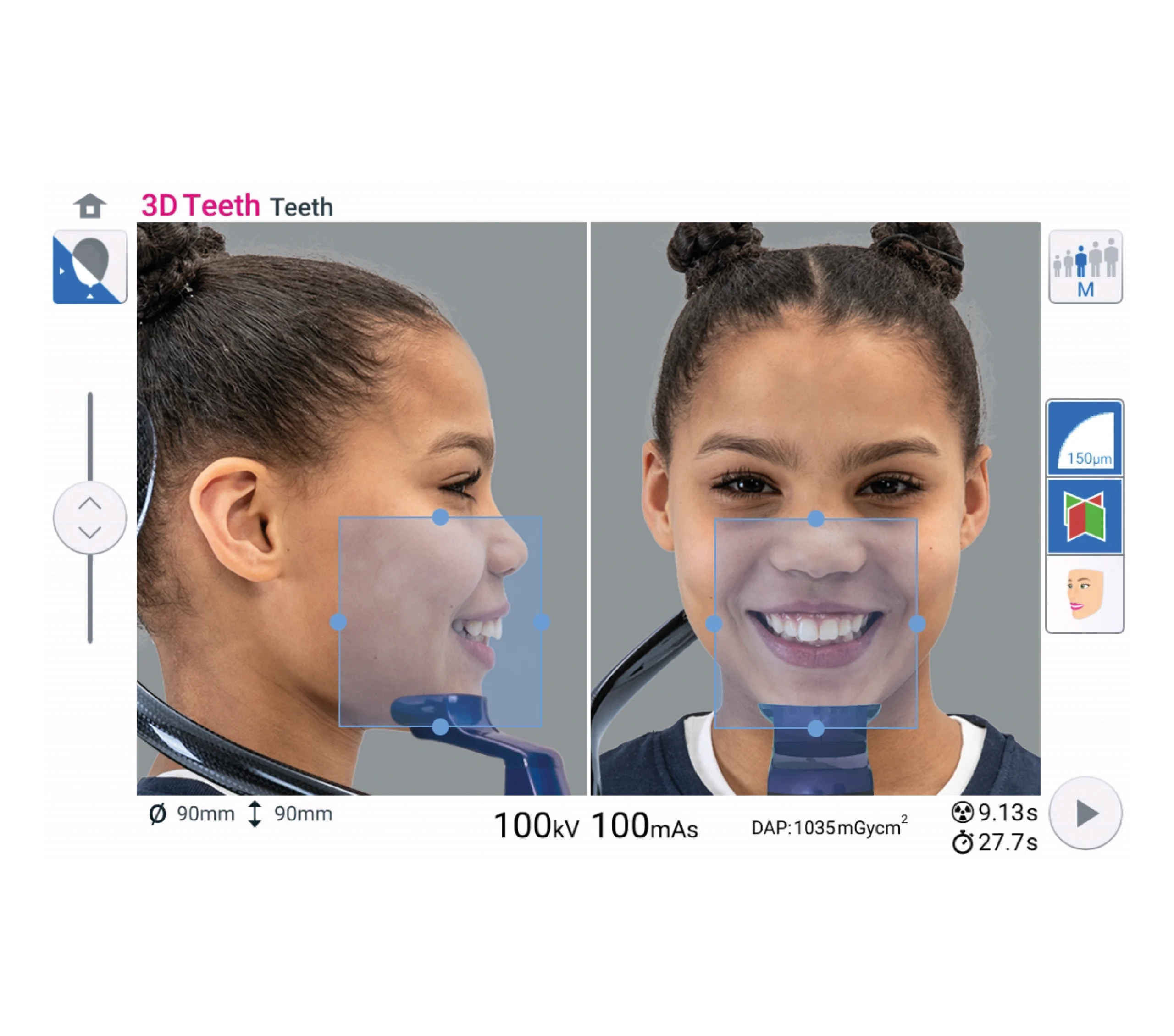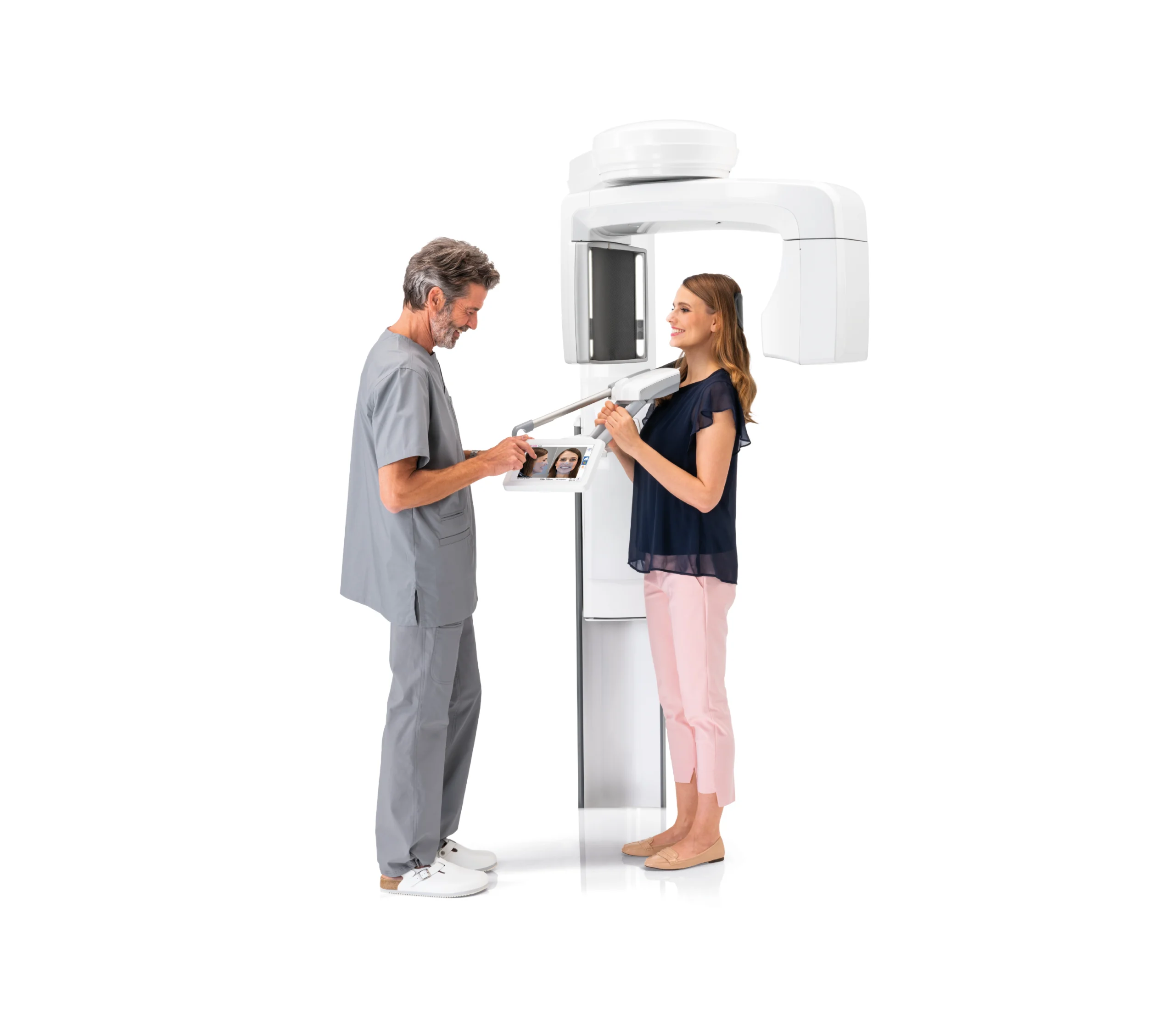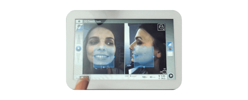 Pozycjonowanie pacjenta odbywa się bezpośrednio z panelu sterowania z wykorzystaniem zintegrowanych kamer i podglądu na żywo, co umożliwia elastyczne i precyzyjne ustawienie pola widzenia (FOV). Otwarta konstrukcja aparatu pozwala pacjentowi być zwróconym twarzą do użytkownika, co poprawia komunikację i komfort podczas badania.